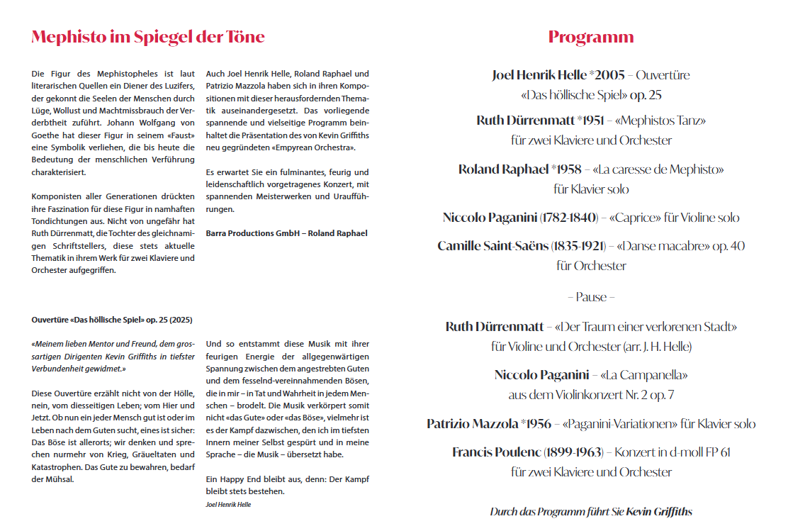 ------------x-------------- -> Freitag, 23. Mai 2025, 18:30 Uhr Musikalischer Abend Semperaula unter Mitwirkung von Patrizio Mazzola, der seine selber komponierten Paganinivariationen spielt Semperaula, ETH HG G 60, Zürich ------------x-------------- -> Dienstag, 8. April 2025, 19:30 Uhr VORTRAGSVEREIN OBERWALLIS Rittersaal Stockalperschloss Brig - Richard Wagner: Isoldes Liebestod (Klavierfassung von Franz Liszt) - Franz Liszt: Mal du pays, aus: «Années de Pèlerinage» für Klavier - Othmar Schoeck: Allegro con spirito, 3. Satz aus der Sonate für Violine und Klavier in D-Dur, op. 16 - Paul Hindemith: Praeludium und Postludium aus «Ludus tonalis» für Klavier - Darius Milhaud: Sonatine pastorale pour violon, op. 383 - Josef Garovi: Andante für Klavier - Eugen Meier: «Skizzen einer Wanderung» und «Berceuse» für Violine und Klavier - Eugen Meier: Variationen über «Weischus dü»? für Klavier ------------x-------------- -> Sonntag, 16. Februar 2025, 17 Uhr